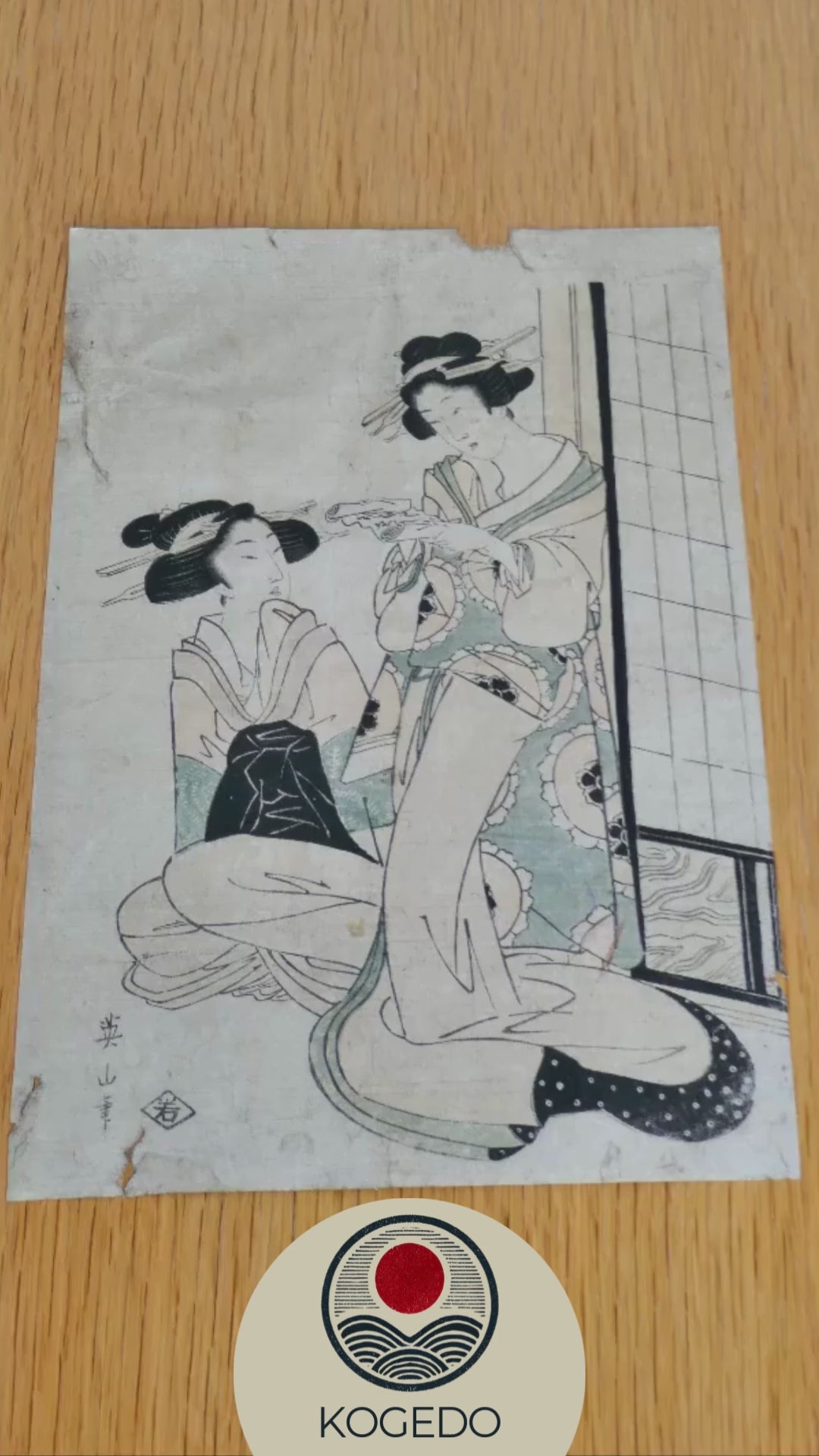 Malgré ses imperfections liées à l'âge, cette œuvre conserve toute la grâce des bijin-ga de l’époque Edo : gestes élégants, kimonos finement dessinés, et cette atmosphère feutrée propre aux scènes d’intimité féminine.