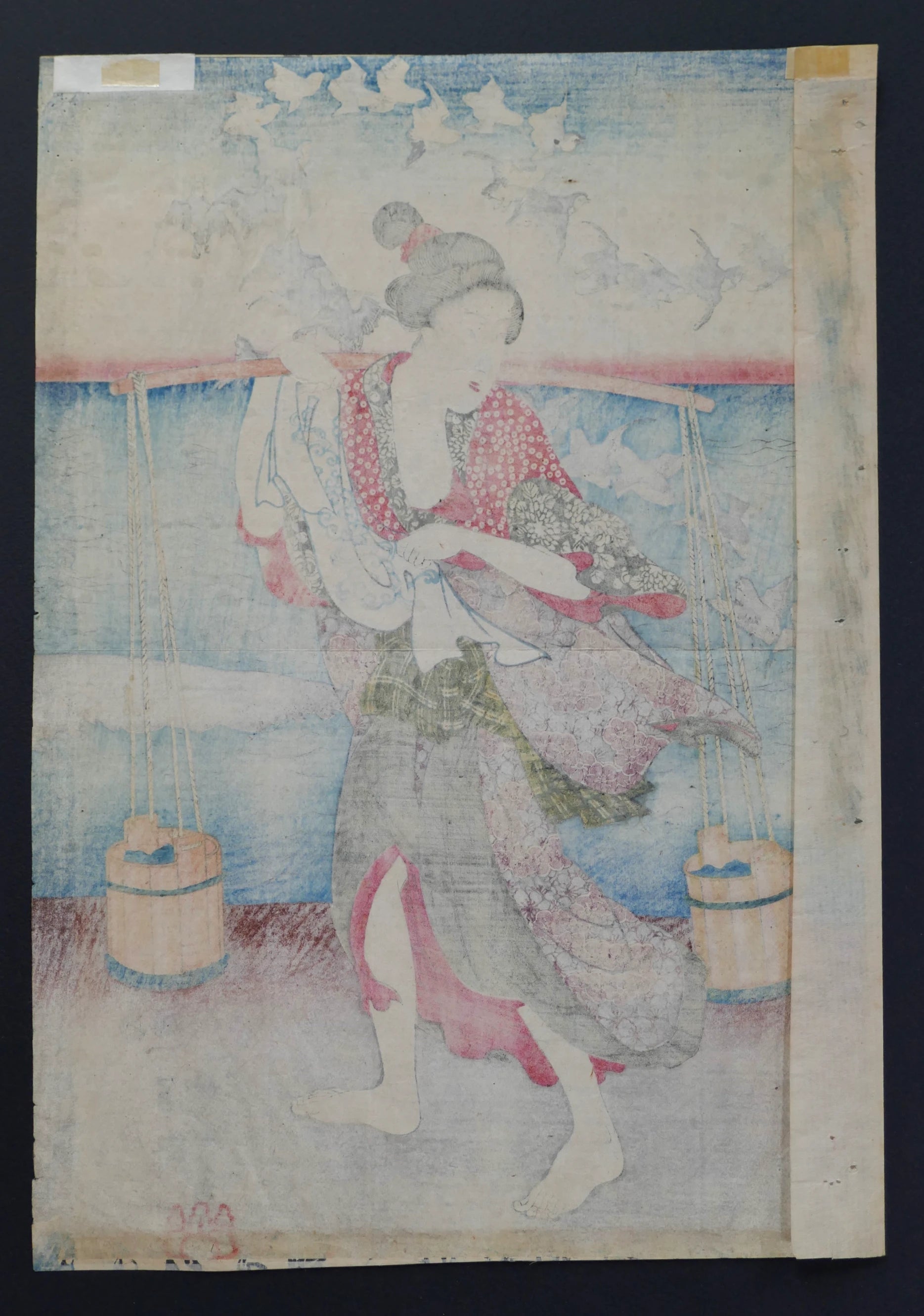 Cette estampe de Kuniyoshi représente une femme au bord du rivage, portant des seaux d’eau suspendus à une perche, tandis que des pluviers (chidori) tournoient au-dessus d’elle. La scène se déroule dans un paysage dans la province de Mutsu (actuel Tôhoku).