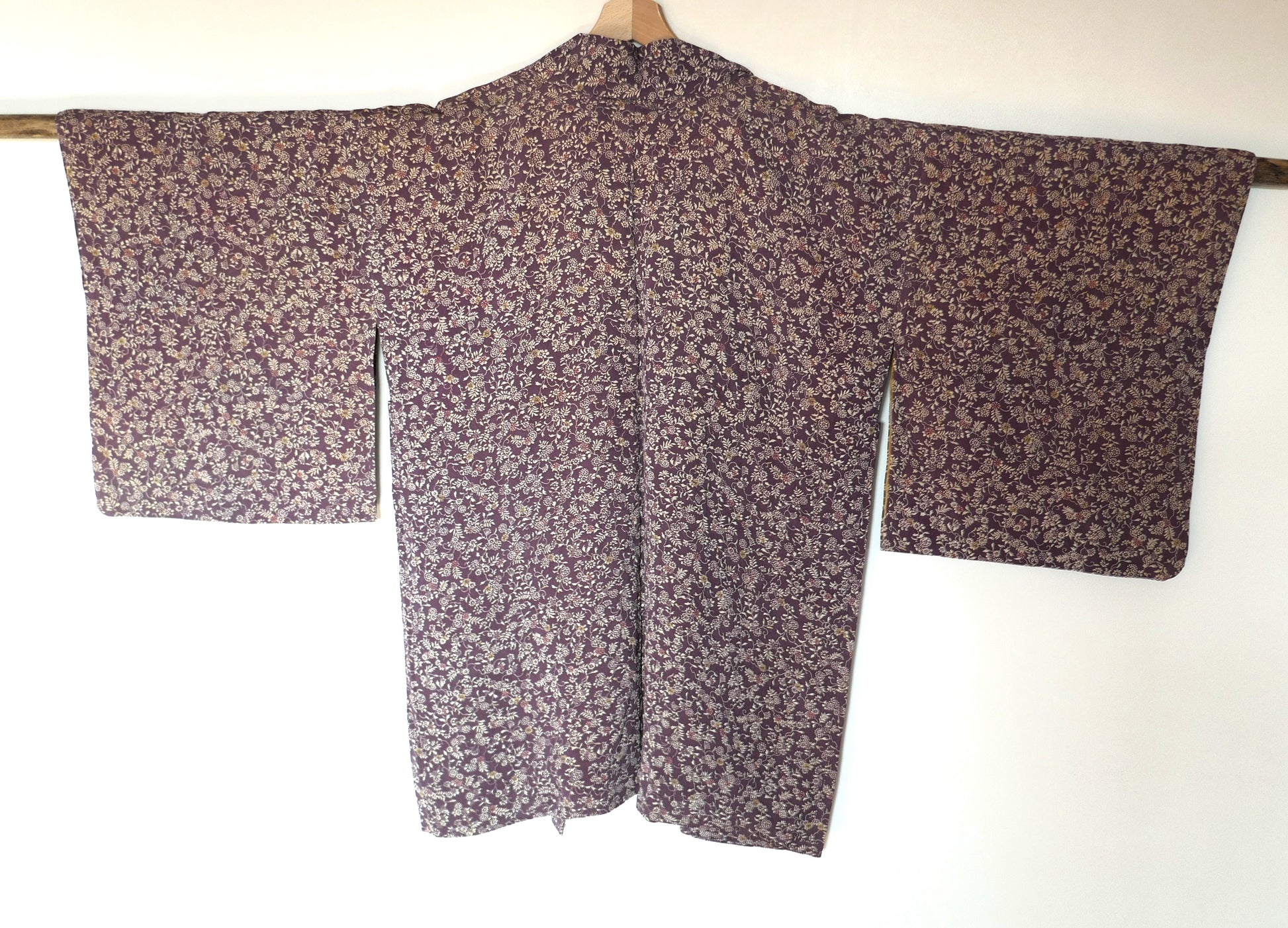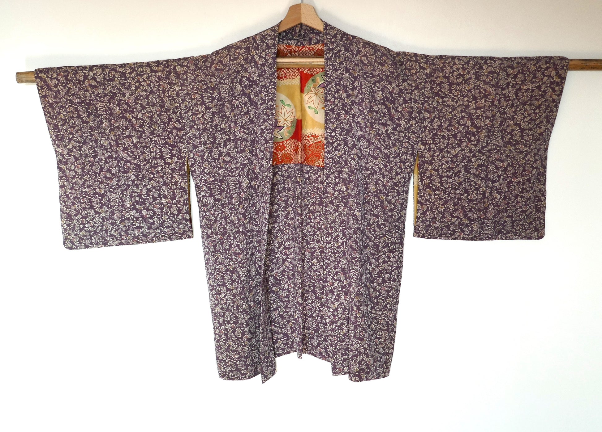 Haori vintage en soie murasaki 紫 violet prune – Veste kimono japonaise motifs floraux & doublure momiji